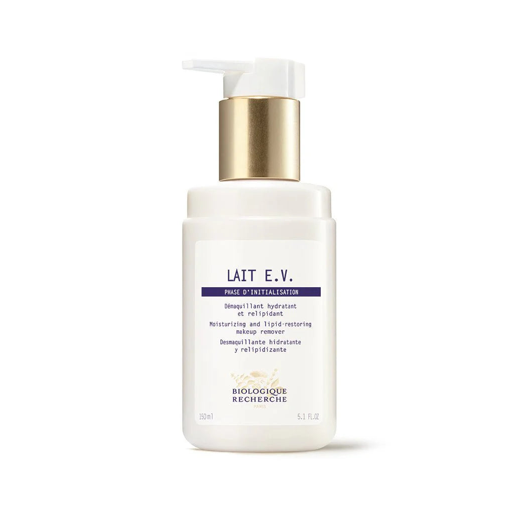 Biologique Recherche's Lait E.V. is a hydrating cleansing milk for very dry and dehydrated skin. It gently removes makeup and impurities, protects the skin's natural barrier, prevents dehydration, and leaves skin velvety soft and soothed. Ideal for winter use.
